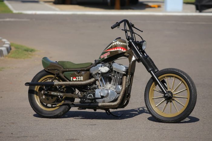 Fork depan bawaan Sportster dibuat rebah 6 inci lalu ditambah dengan desain setang curved-bar serta tangki model peanut.