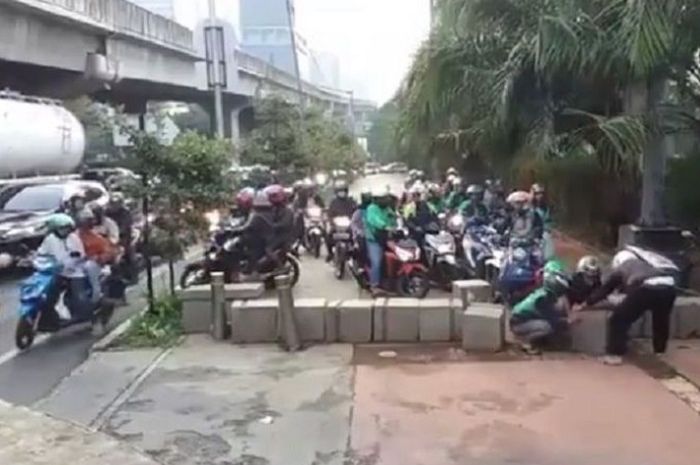Video tersebut memperlihatkan pengendara motor bersama-sama membongkar pembatas trotoar yang menghalangi mereka.