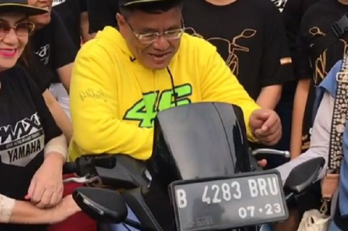 Memakai sweater Valentino Rossi warna kuning, Hotman nampak berpose di atas Maxi Yamaha tersebut.