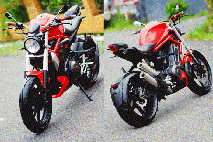 Sekilas memang kental dengan aroma Ducati Monster, tangki berbahan carbon fiber.