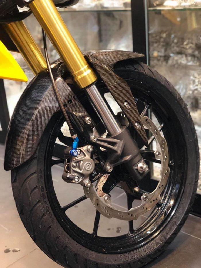 GSX-S150 ini diberi dengan kaliper Brembo yang dipadu dengan selang rem dari Galfer.