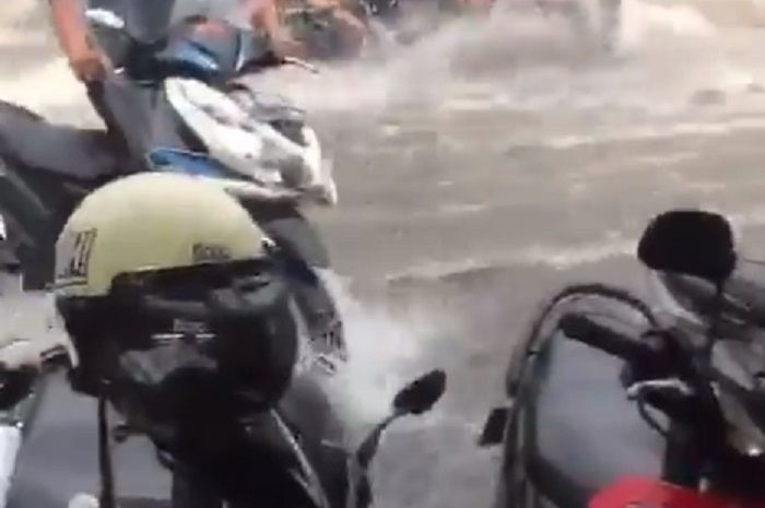 Pemotor Yamaha Aerox nampak juga kesusahan melawan arus air yang sangat deras.