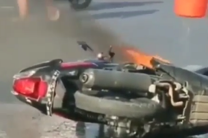 Pada video yang diunggah, terlihat sebuah motor Honda Vario 110 CBS tergeletak di tengah jalan dalam kondisi terbakar.