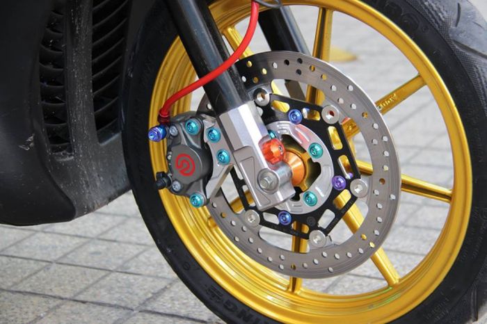 Kaliper rem diganti dengan Brembo 2 piston dan dipadukand dengan cakram Brembo seri Oro.