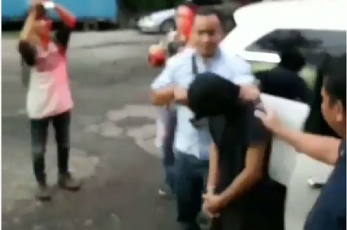 Dalam video, polisi menangkap pelaku dan dimasukan ke dalam mobil.