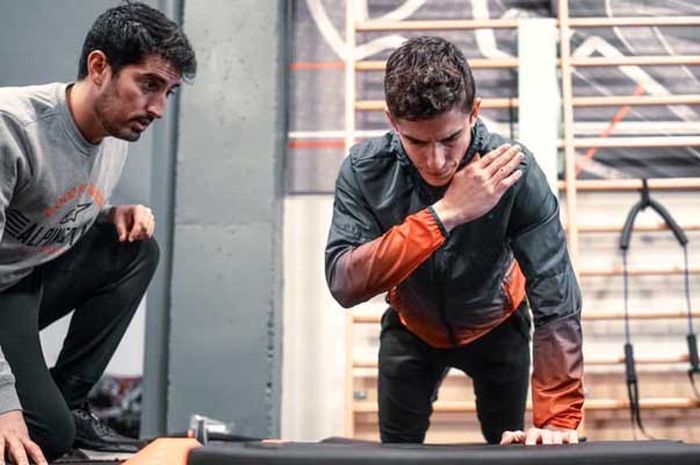 Kali ini, sesi latihannya cukup berat di mana Marc Marquez mengambil posisi push-up dengan lutut menahan beban.