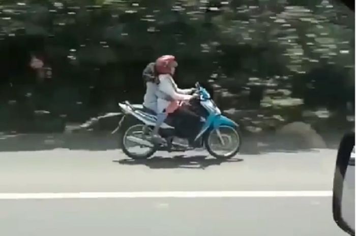 Celakanya, emak-emak memboceng anak kecil tanpa memakai helm.