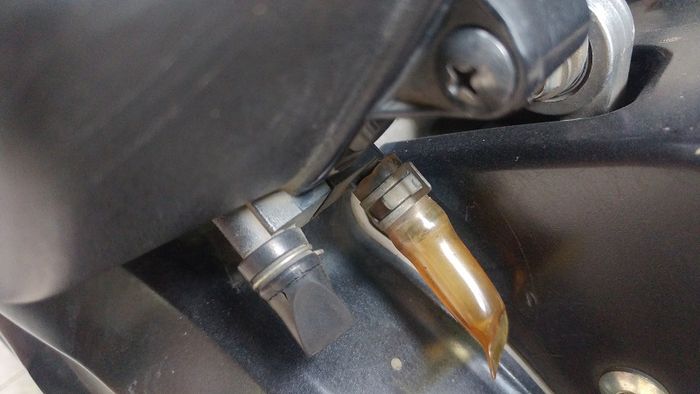 Caranya mudah, enggak perlu sampai membuka cover CVT. Cukup buka slang pembuangan yang berwarna bening menggunakan tangan, biasanya saluran ini posisinya berada di bawahCVT (gbr. 1),” lanjutnya.
