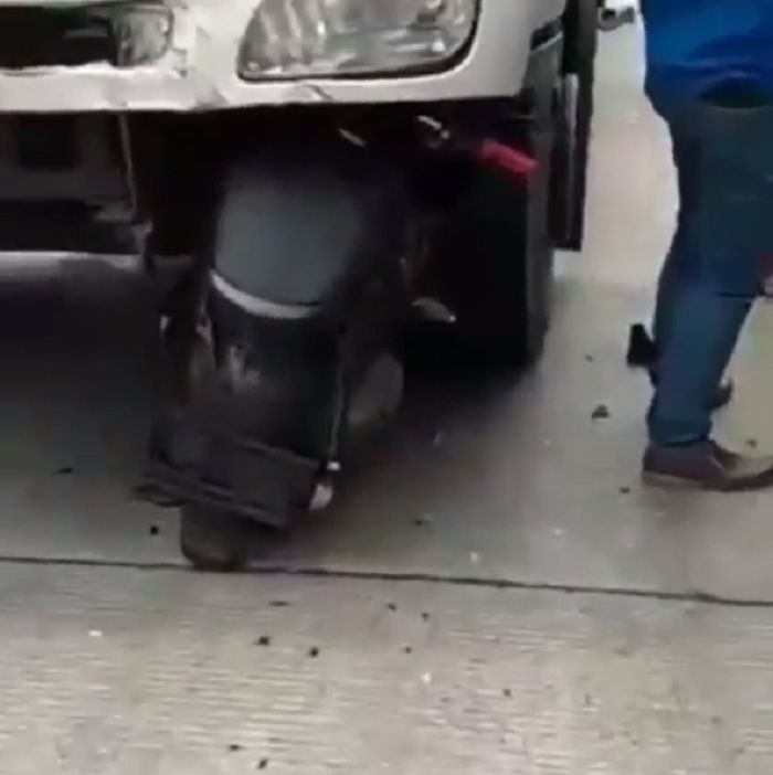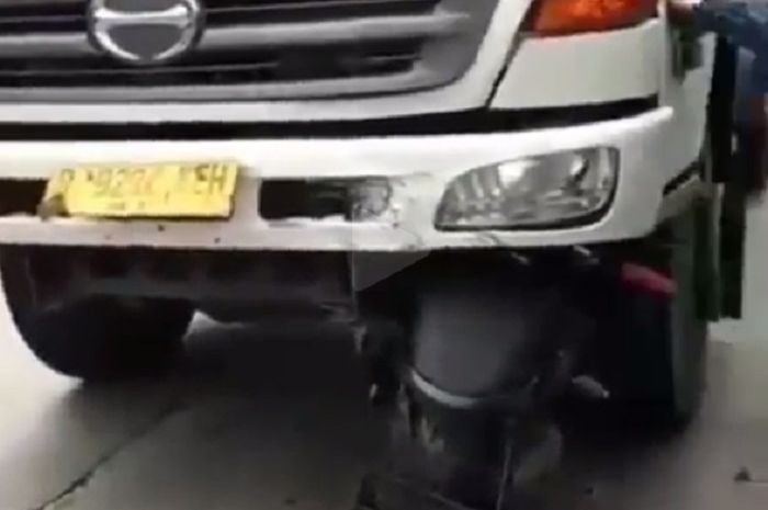 Akibat tabrakan ini, motor masuk kekolong truk Hino dan masih menyangkut.