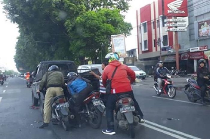 Dari arah belakangnya bersamaan melaju mobil pick up Isuzu Panther, Honda Supra, Honda Revo, dan Honda BeAT.
