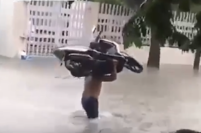 Gara-gara menerjang arus banjir yang sangat deras, motor yang dikendarainya mogok.