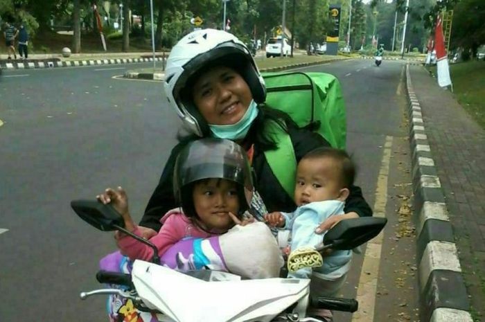 MOTOR Plus-online.com - Bikin salut, kisah seorang driver ojek online (Ojol) wanita yang membawa dua anaknya sembari bekerja.