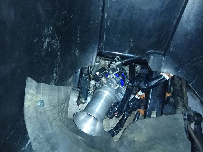 Agar aliran udara yang masuk lebih banyak, throttle body diganti pakai punya Suzuki Satria F-150 FI (FuFi) yang punya diameter venturi 32 mm.