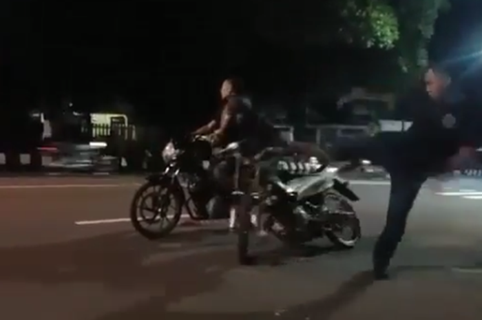 Terlihat dua orang joki balap liar yang mengendarai motor Suzuki Satria F150, tiba-tiba saja dihajar oleh seorang pria.
