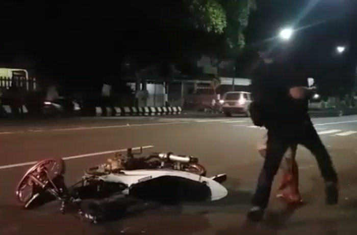 Terlihat dua orang joki balap liar yang mengendarai motor Suzuki Satria F150, tiba-tiba saja dihajar oleh seorang pria.