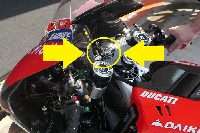Di segitiga atas Desmosedici GP19 yang dipakai Petrucci, Dovizioso, dan Miller, ada sebuah tuas misterius.