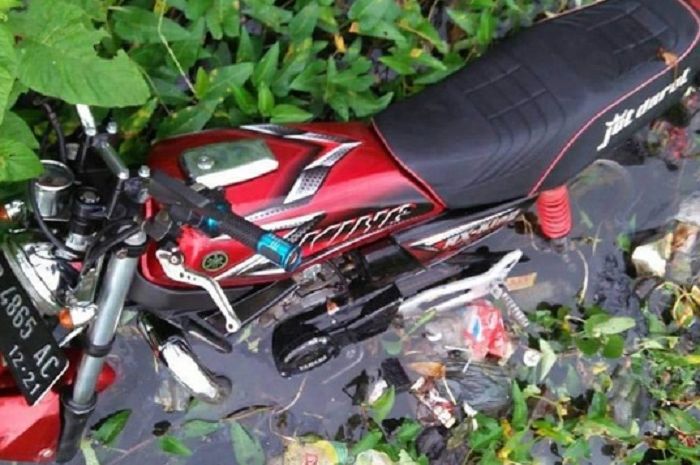 Satu unit motor Yamaha RX King tahun 2008 teronggok di selokan penuh sampah.