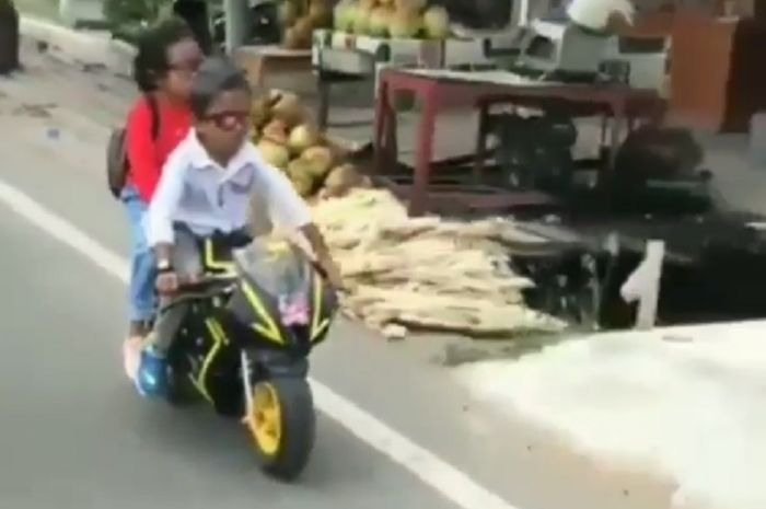 Kedua anak kecil tersebut berboncengan mengendarai sebuah motor MiniGP layaknya sepasang kekasih.