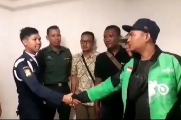 Disaksikan anggota TNI dan polisi, satpam di Kota Kasablanka itu akhirnya bersalaman dengan pengojek online.