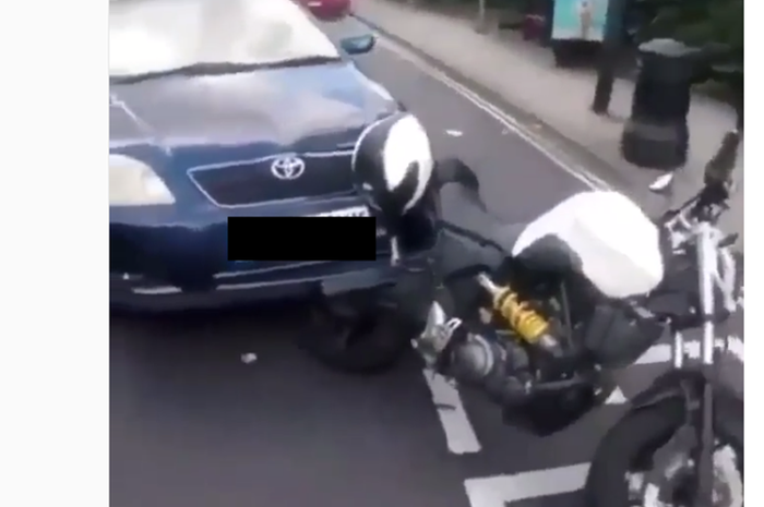Akhirnya, pengendara mobil bisa menantang balik, dan malah menabrak pengendara motor sampai jatuh terkapar.