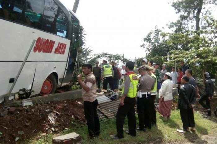 Bus Sugih Mukti tersebut menabrak mobil, motor, benteng rumah, dan berhenti setelah menabrak pohon cemara.