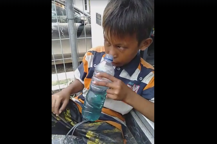 Bocah ini terlihat setengah sadar sembari menggenggam sebuah botol air mineral 600 mililiter berisi cairan berwarna biru di tangannya.
