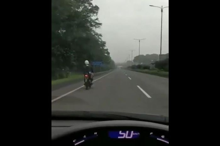 Si pemotor dengan santainya mengambil bahu kiri jalan tol.