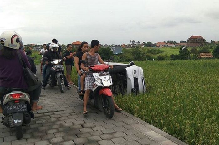 Yaitu selfie di sawah, dimana ada mobil yang nyemplung atau jatuh ke sawah, di sebuah jalur unik.