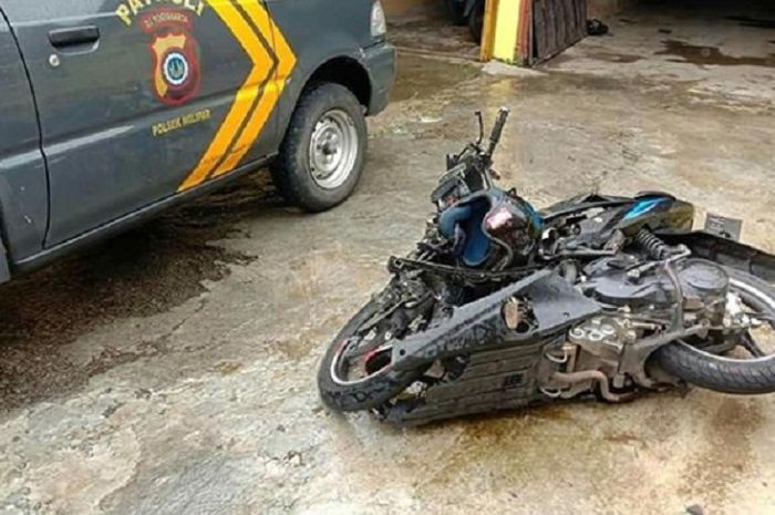 Kerasnya benturan membuat motor matic itu hancur terlipat dua.