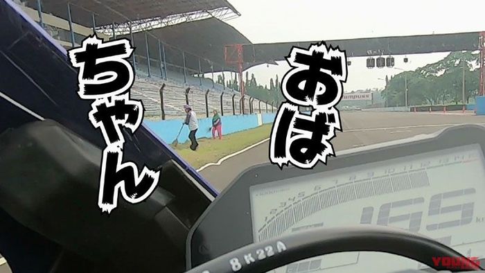 Lalu, saat sedang top speed di trek lurus, kedua orang Jepang tersebut heran ada yang sedang menyapu di pinggir trek.