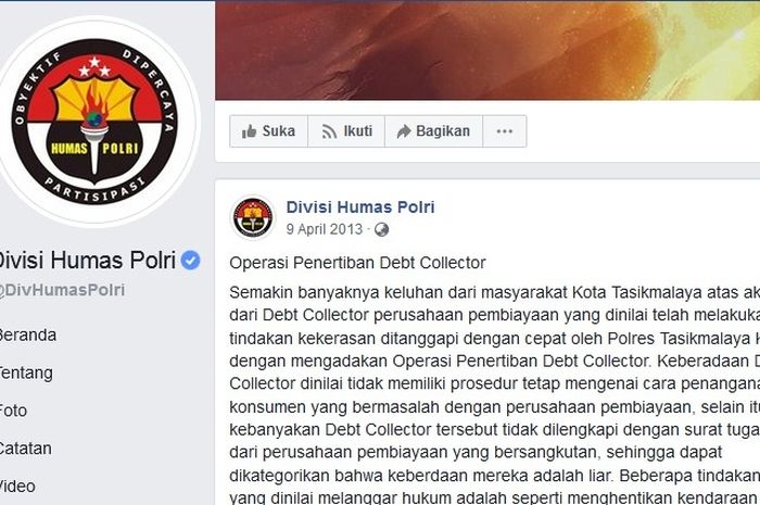 Secara resmi melalui akun Facebook Divisi Humas Mabel Polri mengumumkan Operasi Penertiban Debt Collector.