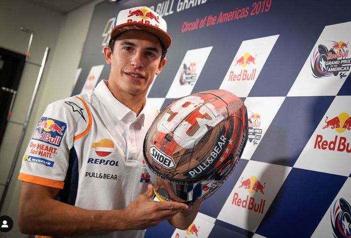 Jangan pikir aneh-aneh, karena kayu yang dipakai Marc Marquez di MotoGP Amerika, hanyalah motif cat.