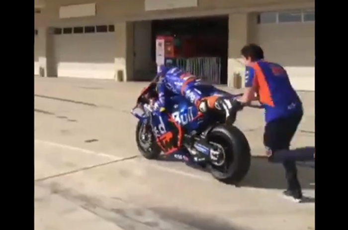 Karena di belakangnya, ada kru tim Red Bull KTM Tech3, yang mendorong Syahrin.
