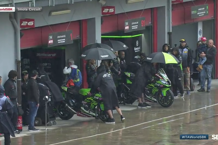 MOTOR Plus-online.com - Cuaca tidak bersahabat saat akan berlangsung Race 2 WSBK Italia 2019.