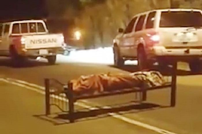 Dua dari tiga jenazah yang ditemukan di tengah jalan dalam posisi membentang di tempat tidur dan tertutup kain.