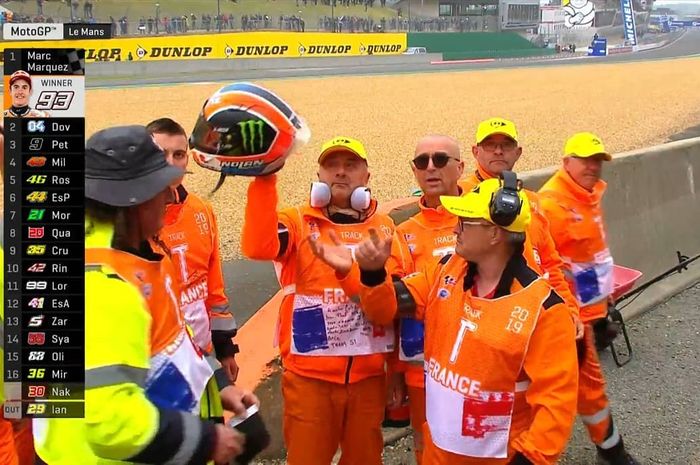 Itu karena setelah bendera finish berkibar, Alex Rins menunjukkan gestur unik dari atas motornya.