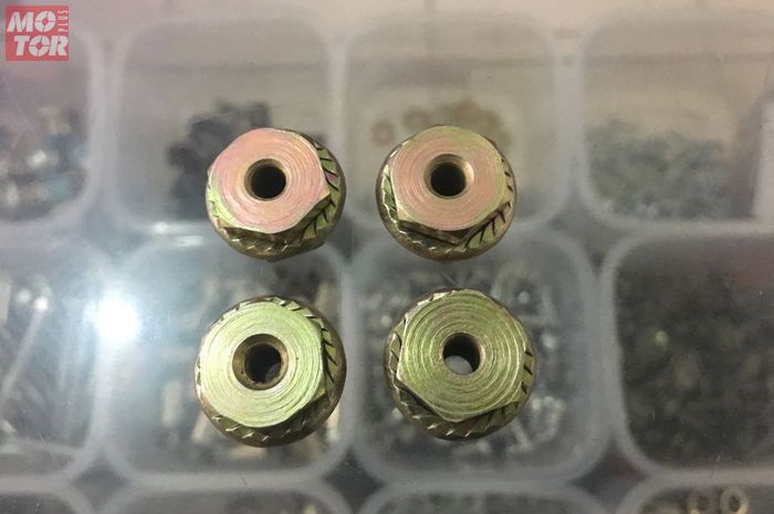 Solusinya bisa gunakan mur yang berbahan besi kuningan, yang jauh lebih kuat dibanding mur bawaan.