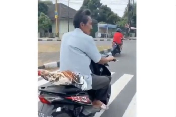 Pria yang mengendarai Honda BeAT itu terlihat membonceng seekor ayam tanpa diikat sama sekali.