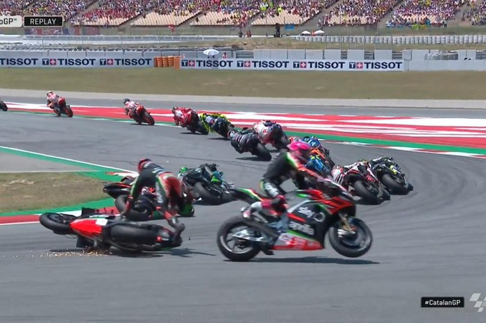 Bradley Smith menyebabkan Aleix Espargaro mengalami highside di tikungan 10 saat belum genap menyelesaikan lap pertama.