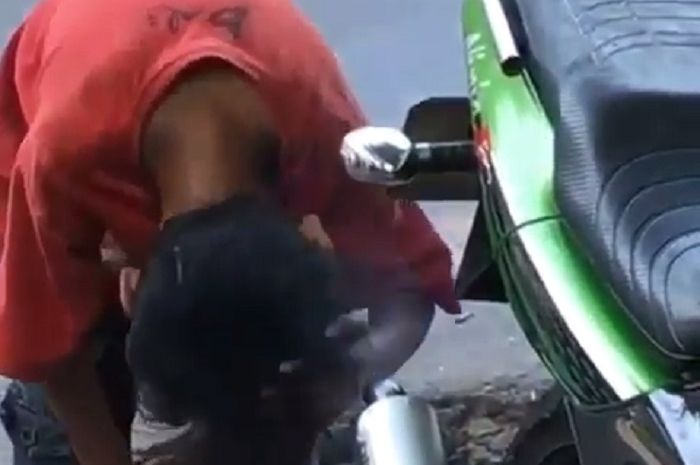Asap yang keluar dari knalpot Ninja itu pun terlihat mengerubungi rambut bocah tersebut.