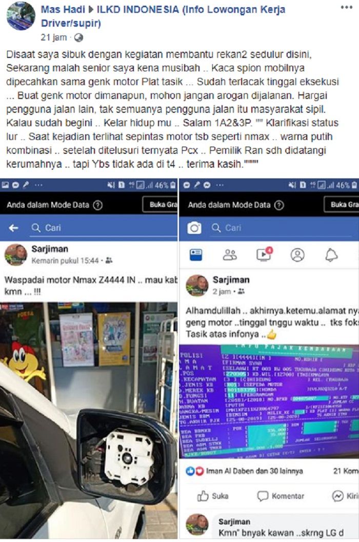 Disaat saya sibuk dengan kegiatan membantu rekan2 sedulur disini, Sekarang malah senior saya kena musibah .. Kaca spion mobilnya dipecahkan sama genk motor Plat tasik ... Sudah terlacak tinggal eksekusi ... Buat genk motor dimanapun, mohon jangan arogan dijalanan. Hargai pengguna jalan lain, tak semuanya pengguna jalan itu masyarakat sipil. Kalau sudah begini .. Kelar hidup mu .. Salam 1A2&3P. "" Klarifikasi status lur .. Saat kejadian terlihat sepintas motor tsb seperti nmax .. warna putih kombinasi .. setelah ditelusuri ternyata Pcx .. Pemilik Ran sdh didatangi kerumahnya .. tapi Ybs tidak ada di t4 .. terima kasih.
