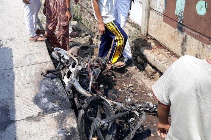 Motor skutik yang dipinggirkan hingga masuk ke saluran air pun terbakar habis, hingga menyisakan kerangkanya saja.