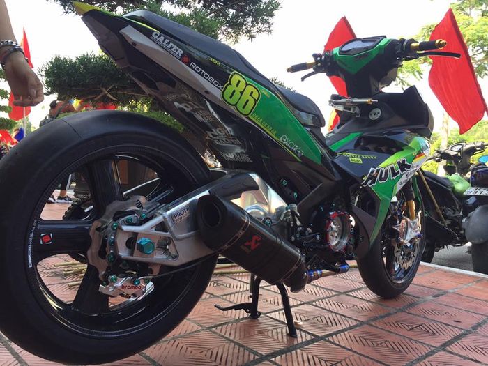Sementara untuk kaki belakangnya, Jupiter MX King ini memakai swingarm jumbo punya BMW S1000RR dengan monoshock Ohlins.