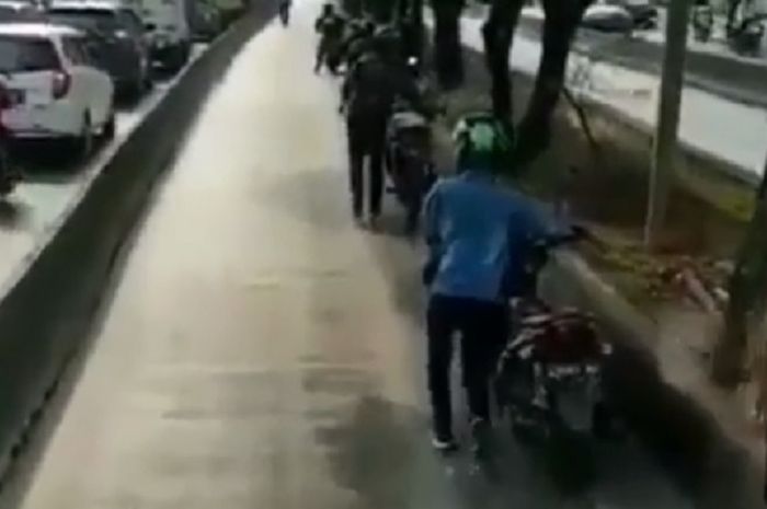 Sebuah video beredar di media sosial Instagram, menunjukkan beberapa pemotor yang sedang mendorong sepeda motornya di jalur bus Transjakarta.