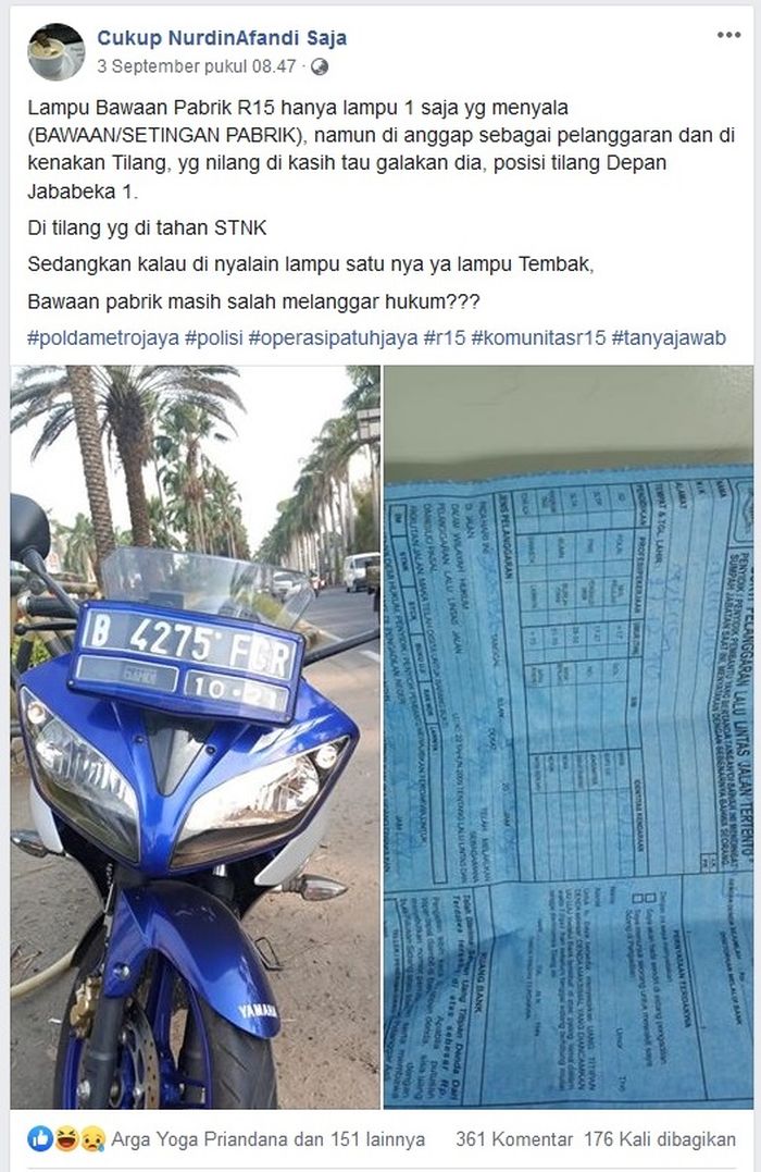 Lampu Bawaan Pabrik R15 hanya lampu 1 saja yg menyala (BAWAAN/SETINGAN PABRIK), namun di anggap sebagai pelanggaran dan di kenakan Tilang, yg nilang di kasih tau galakan dia, posisi tilang Depan Jababeka 1.