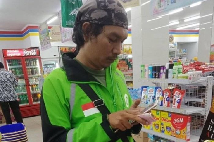 Seorang driver ojol mendadak lemas, matanya memerah seketika menahan tangis di depan kasir sebuah minimarket.