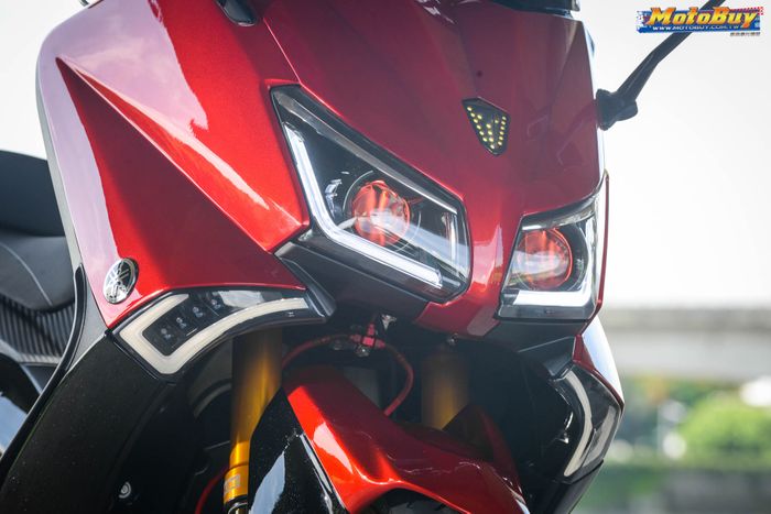 Dari depan, lampu skutik moge berkapasitas 530 cc ini sudahh menganut model proyektor yang didalamnya sudah ditanam devil eyes berwarna merah senada bodi.