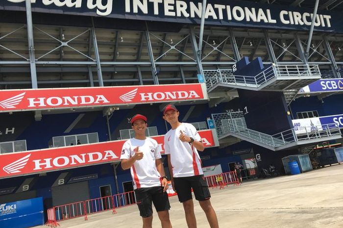 Tampak foto Dimas Ekky Pratama dan Somkiat Cantra dengan latar belakang grand stand sirkuit Buriram, Thailand.