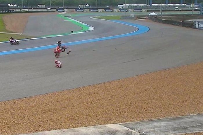 Marc Marquez mengalami insiden crash di tikungan 7 sirkuit Buriram dan mengalami high side.