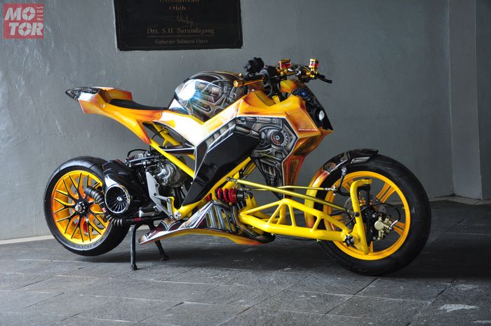 Setelah itu, baru dibuatkan bodi dari bahan fiberglass dengan bentuk yang terbilang futuristik, yang kemudian dikasih cat dasar kuning dan ditimpa airbrush bertema Bumblebee.